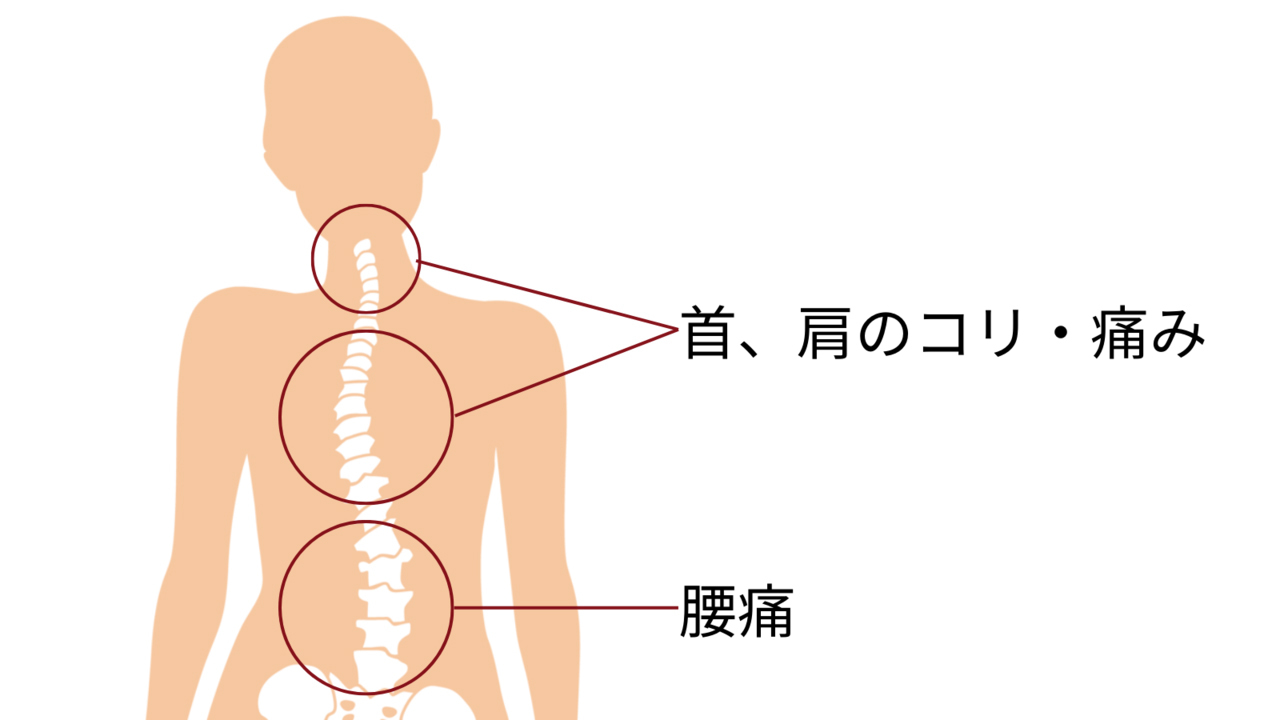 この歪みが、首・肩・腰の筋肉に余計な負担をかけることになり、この負担によって筋肉が硬直。これがコリや痛みの原因になっているのです。