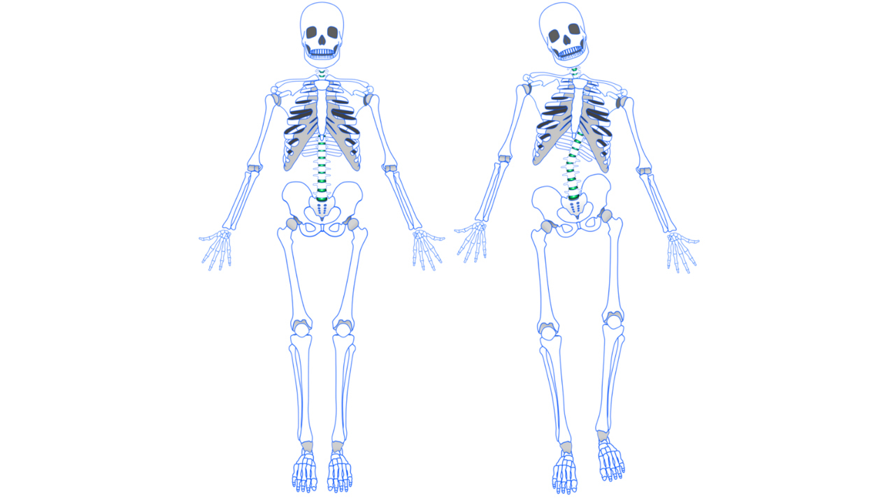 左が正常な状態で、右が頭が傾いた結果、無理にバランスを取ろうとしてる状態です。骨格がかなり歪んでしまっているのがわかりますね。