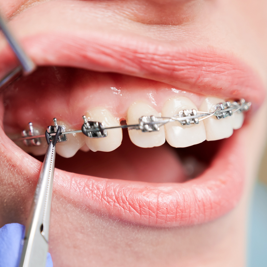 ブラケットという装置とワイヤーを歯に装着し、歯並びを整える矯正法です。唇側矯正、表側矯正とも呼ばれます。